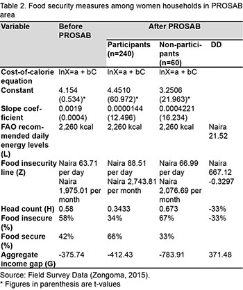 The Cost-of-calorie index (Table 2) showed that, based on the daily energy level of 2,250 Kcal recommended by Food and Agriculture Organization, the food security line per adult equivalent per month was N2,743.81 and N2,076.69 for the participants and non-participants, respectively. The results also showed that 66% of the participants and 33% of the non-participants were food secure.