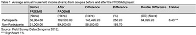 Findings from the Double Difference (DD) estimates (Table 1) showed that the average annual income of the participants increased, suggesting a positive impact on income although other factors such as age, education and marital status may have influenced income. | ![]() |