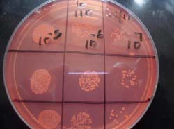 Left: Serial dilution and plating Right: Rhizobium colonies on Yeast-mannitol agar containing Congo Red