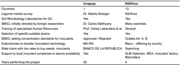 If we compare the process between Uruguayan SMICL and N2AFRICA, we can find in Table 1 that the process has been almost identical, but with very important aspects to remark in the African process: N2Africa has attempted in 4 years almost the same activities (and surely in major quantities) that we succeeded in achieving over almost 5 decades.