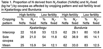 The within-row intercrops provided significantly greater grain yield than the 1 to 1 and 2 to 2 distinct row intercrops, both of which did not differ significantly. Cowpea grain yield was significantly larger in Bundunia, while maize grain yield was significantly greater in Kpataribogu. Maize and cowpea grain yields declined with soil fertility level. The high fertility fields significantly (P<0.001) provided larger grain yields than the low fertility fields. The proportion of N derived from N2-fixation (%Ndfa) generally did not differ between intercrop and sole crop (Table 1).