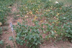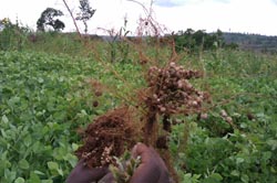 The results so far showed variability in rhizobia population following soil origin. Both soyabean and bean nodulated well in some fields but not in others. The grain yield in all sites increased with increasing manure rates. Grain yield of uninoculated plots also increased with increasing manure rates. The pictures below show well nodulated soyabean in one site (Plate 1) and two plots of soyabean showing differences: one with manure addition (Plate 2) and the other one without (Plate 3).