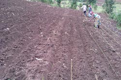 In the last week of March, 2014, 14 field trials have been established in Northern Province of Rwanda. This area is one of the major climbing bean growing areas in Rwanda. Fields were selected based on soil fertility differences. These trials aimed at exploring the possible mechanisms behind the response of climbing bean to manure application even at lower rates. Different farm yard manure rates were used with or without N, P, K or NPK application. The pictures below show farmers weighing manure to be used and a field on preparation for planting. Farmers were curious as weighing prior to application is not a common practice.