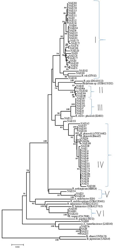 The evolutionary phylogeny based on multilocus sequence analysis (MLSA) grouped the new strains into VI clusters and mostly with Rhizobium etli (CFN42), R. phaseoli (ATCC14482), R. aethiopicum (HBR26) and R. etli bv. phaseoli (IE4803) type strains, cluster I-V (Fig. 1). Strains (NAK91 and NAK103) originated from Kenya and one of our new isolate NAE165 clustered (cluster VI) with R. tropici (CIAT899) commercial strain at 100% boot strap of nucleotide similarity. In a previous study using 16S rRNA and concatenated recA and atpD genes, NAK103 was grouped with R. phaseoli (ATCC14482) (Mwenda et al. 2018). This difference might be due to mislabelling during sharing the strains or due to differences in resolution capacity of the loci used. A few new isolates such NAE6, NAE55, etc. clustered with Agrobacterium radiobacter (LMG140).